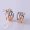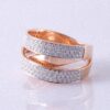 A chunky crisscross band ring with round cut diamonds boasts a G-H color and VS-SI clarity, resting on 18K Italian rose gold by Diagold Jewelry.