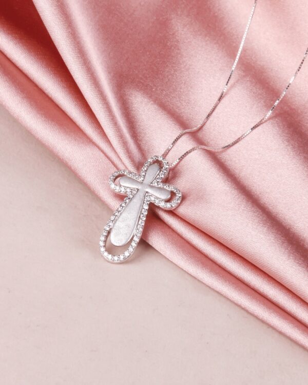 Refined elongated cross pendant in round cut diamonds shining in 14K white gold by Diagold Jewelry.