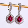 A pair of drop earrings in cushion cut with round cut diamond halo boasts a K color and SI clarity, resting on 14K yellow gold by Diagold Jewelry.