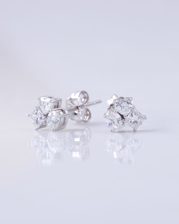 A pair of stud earrings featuring multi-cut diamonds boasts a J color and SI clarity resting on 18K Italian white gold by Diagold Jewelry.