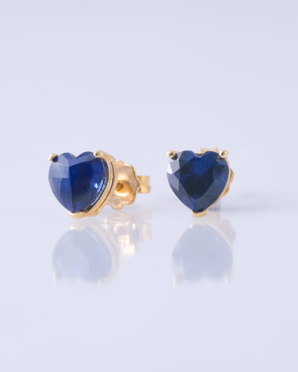 A pair of heart cut blue sapphire stud earrings resting on 14K Italian yellow gold by Diagold Jewelry.