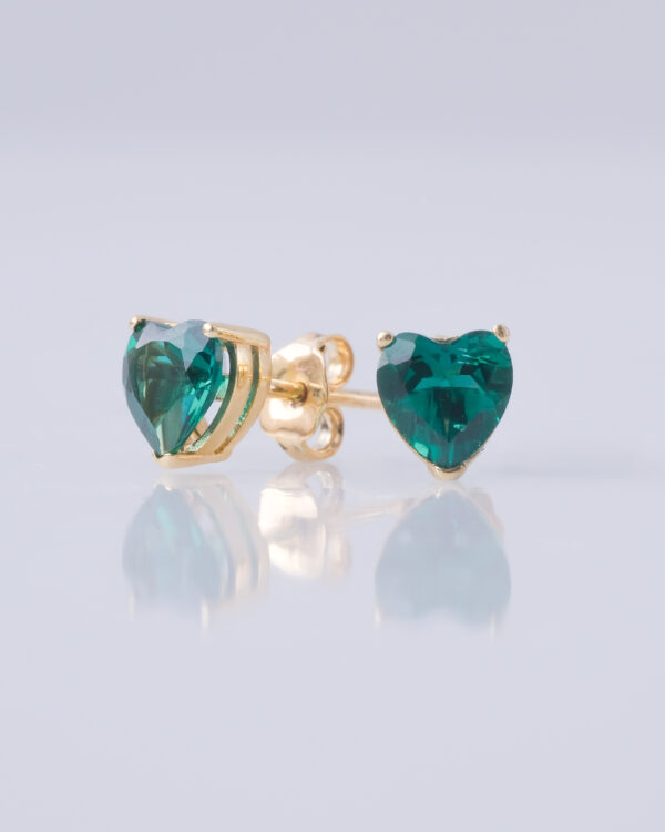 A pair of heart cut emerald stud earrings resting on 14K Italian yellow gold by Diagold Jewelry.
