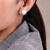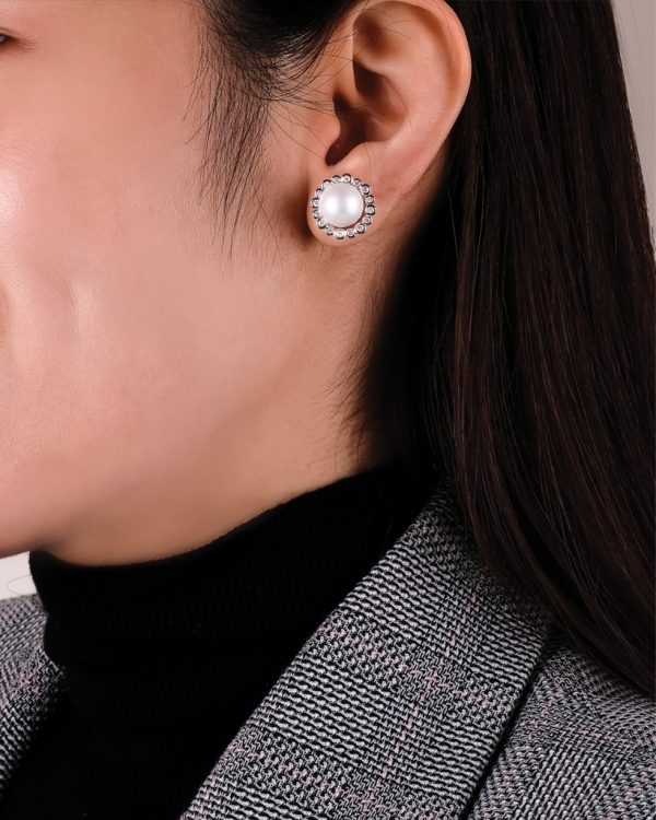 A pair of detachable stud earrings in round south sea pearl and round cut diamonds boast a G-H color and VS-SI clarity, resting on 14K Italian white gold by Diagold Jewelry.