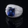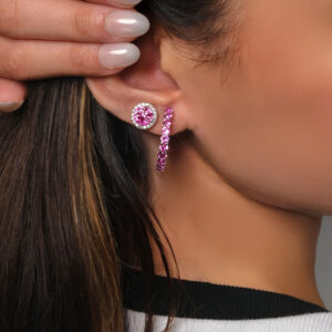 A diamond eternity necklace in round and tapered cut diamonds boasts a G-H color and VS-SI clarity, resting on 18K white gold by Diagold Jewelry.