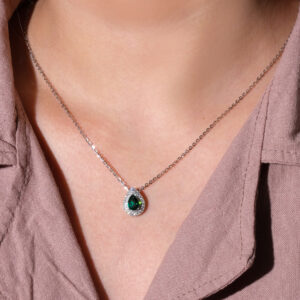 A pair of statement drop earrings in pear cut natural emeralds, and pear and round cut diamonds boast a G-H color and VS-SI clarity, resting on 18 karat white gold.