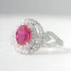 A statement oval cut blue sapphire ring with round cut diamonds, resting on 18K Italian white gold by Diagold Jewelry.