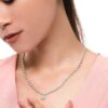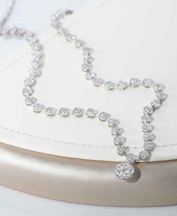 A cluster necklace in round cut diamonds boast a G-H color and VS-SI clarity, resting on 18K white gold by Diagold Jewelry.