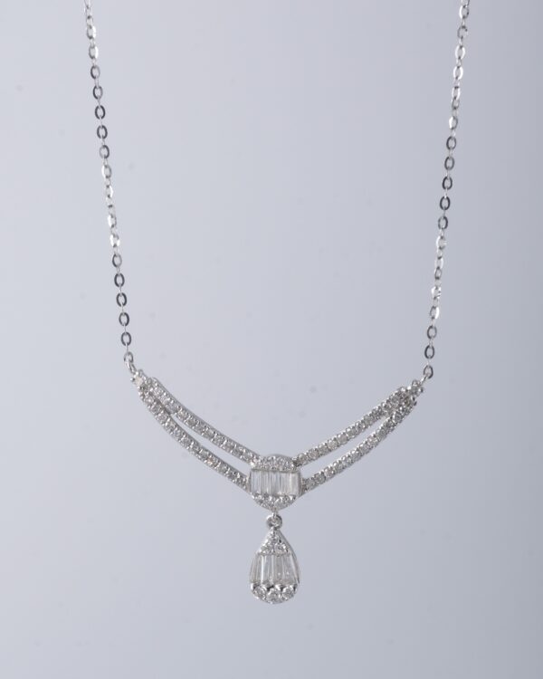 A diamond necklace crafted in round and tapered cut diamonds boast G-H color and SI clarity glowing in 18K white gold setting by Diagold Jewelry.