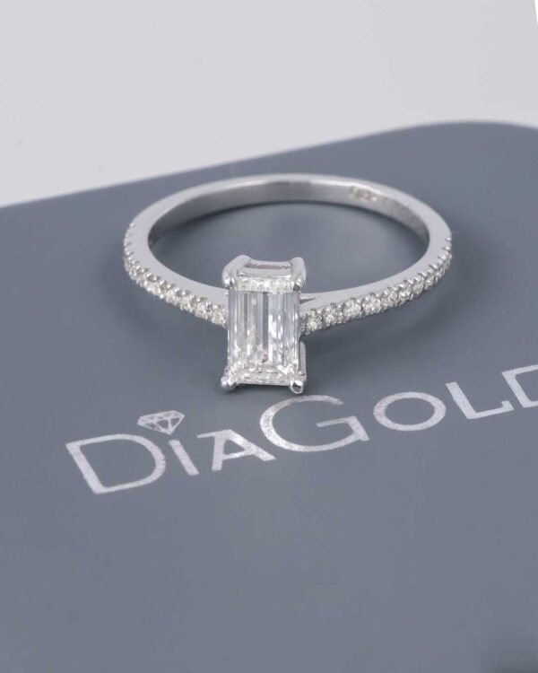 A pave ring in emerald cut diamond and round cut diamonds boasts a G-I color and SI1 clarity, resting on 18K white gold by Diagold Jewelry.