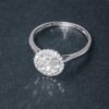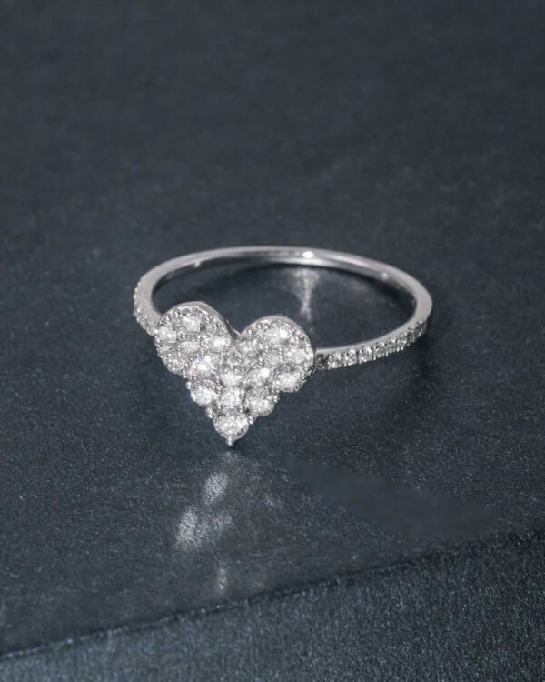 A dainty heart ring in round cut diamonds boasts a G-H color and VS-SI clarity, resting on 18K Italian white gold by Diagold Jewelry.