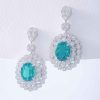 A pair of drop earrings in oval cut ruby and diamonds boast a G-H color and VS-SI clarity, resting on 18K white gold by Diagold Jewelry.