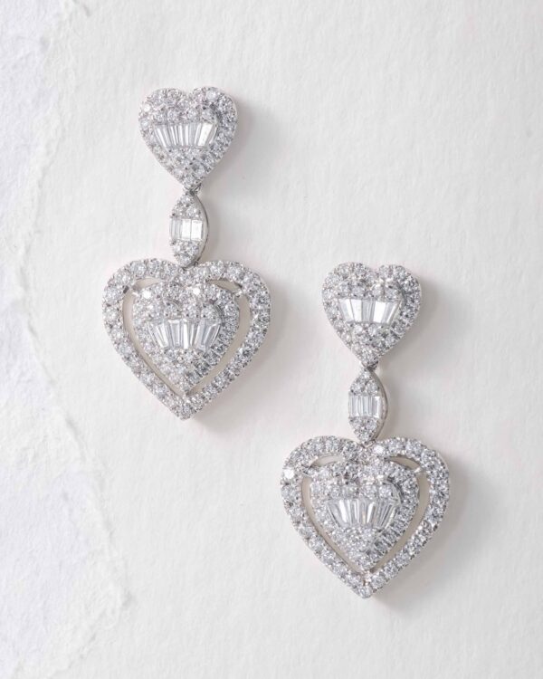 A pair of heart dangle earrings in round and tapered cut diamonds boast a G-H color and VS-SI clarity, resting on 18K white gold by Diagold Jewelry.