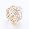 A multi-layered ring in round and emerald cut diamonds boasts a G-H color and VS-SI clarity, resting on 18K Italian yellow gold by Diagold Jewelry.
