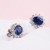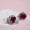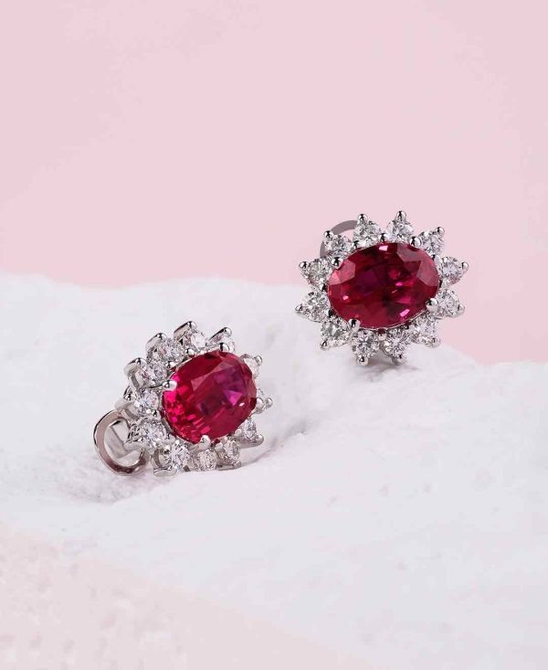 A pair of stud earrings in oval cut ruby and round cut diamonds boast a G-H color and VS-SI clarity, resting on 18K white gold by Diagold Jewelry.