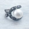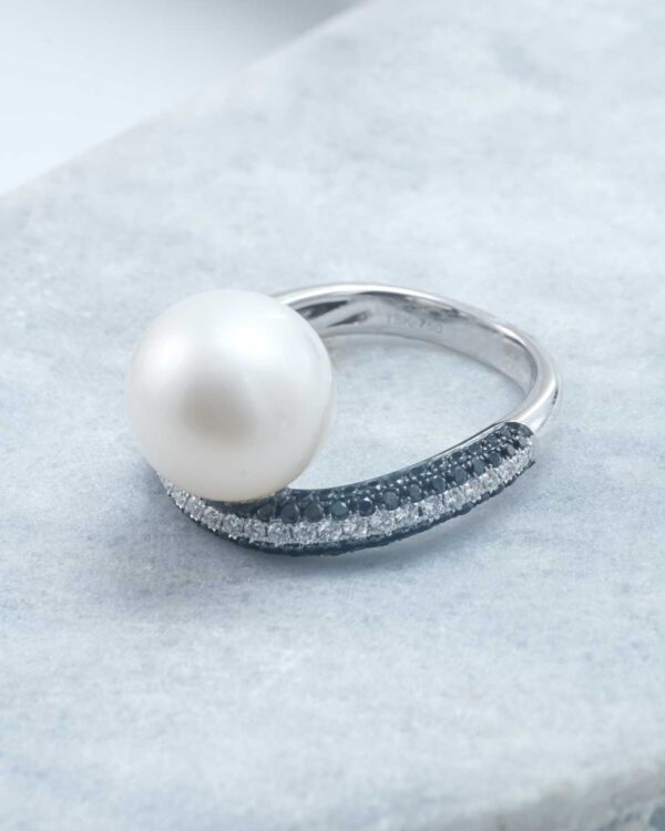 A pearl ring in South Sea pearl and round cut diamonds and black diamonds boasts a G-H color and VS-SI clarity, resting on 18K white gold by Diagold Jewelry.
