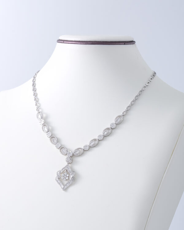 A necklace in round and tapered cut diamonds boast a G-H color and VS-SI clarity, resting on 18K white gold by Diagold Jewelry.