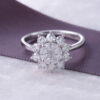 A flower ring in tapered and round cut diamonds boasts a G-H color and VS-SI clarity, resting on 18K Italian white gold by Diagold Jewelry.
