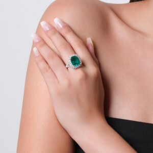 A majestic emerald necklace with round cut diamonds boast a G-H color and VS-SI clarity, resting on 18K white gold setting by Diagold Jewelry.