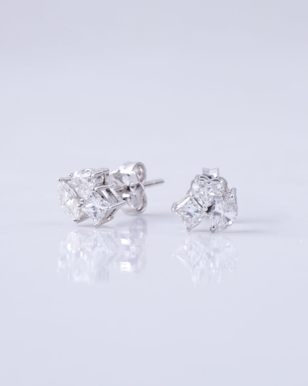 A pair of stud earrings featuring multi-cut diamonds boasts a J color and SI clarity resting on 18K Italian white gold by Diagold Jewelry.