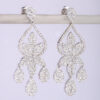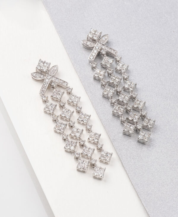 A pair of dangle earrings in round, emerald, oval, and marquise cut diamonds, resting on 18K white gold by Diagold Jewelry.
