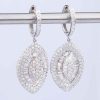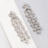 A pair of chandelier dangle earrings in round cut diamonds, resting on 18K white gold by Diagold Jewelry.