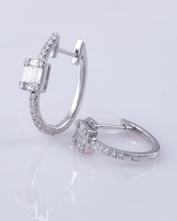 A pair of huggie earrings in emerald illusion cut diamonds boast VS-SI clarity and G-H color, resting on 18K white gold by Diagold Jewelry.