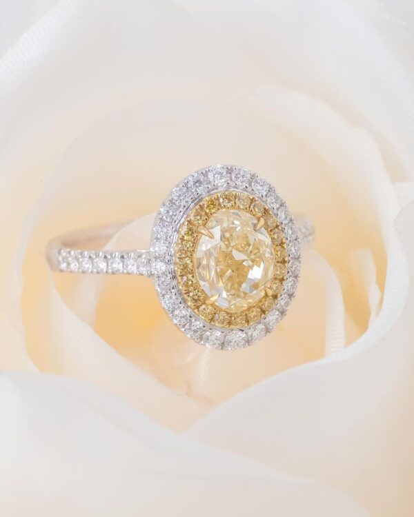 A halo ring featuring a 2.0 carat oval-cut yellow diamond as the center stone, accented with .404 carats of diamonds boasting G-H color and VS-SI clarity, resting on 18K two-tone Italian white and yellow gold by Diagold Jewelry.