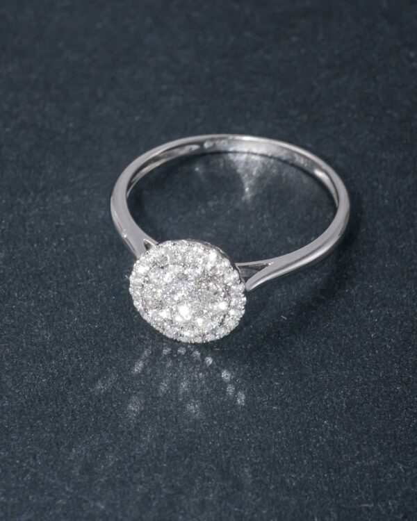 A dainty ring in round cut diamonds boasts a G-H color and VS-SI clarity, resting on 18K Italian white gold by Diagold Jewelry.
