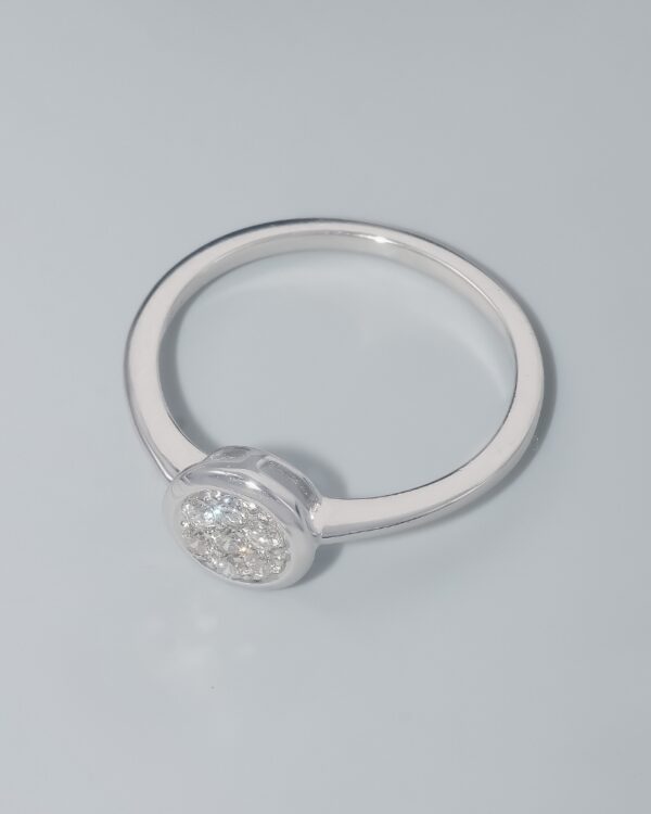 A dainty ring in round cut diamonds boasts a G-H color and VS-SI clarity, resting on 18K Italian white gold by Diagold Jewelry.
