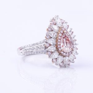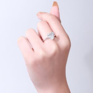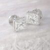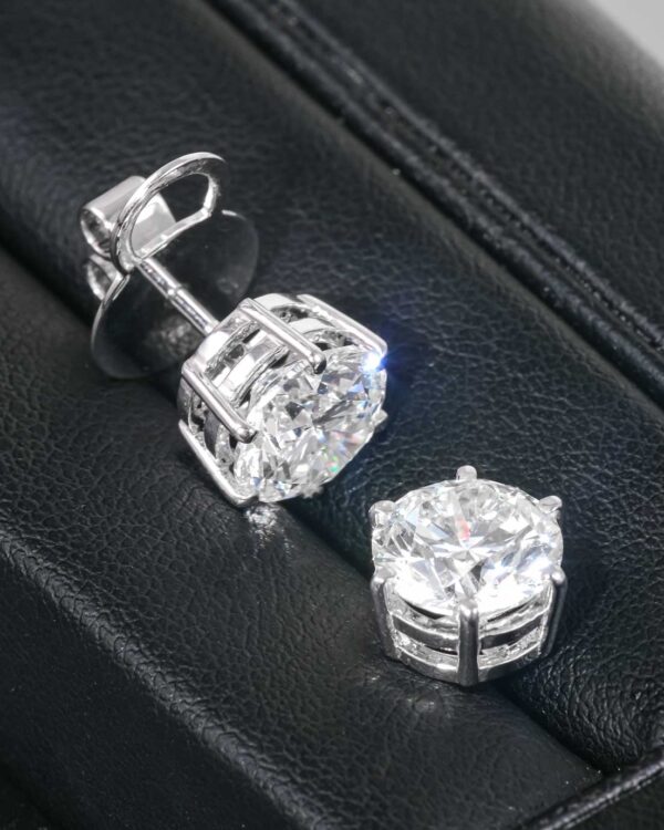 A pair of solitaire stud earrings in GIA-certified round cut diamonds boast a J color and VVS2-VS1 clarity, resting on 18K white gold by Diagold Jewelry.