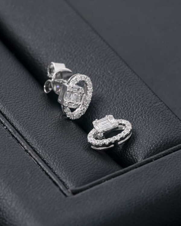 A pair of dainty diamond earrings in round and tapered cut diamond boasts a G-H color and VS-SI clarity, resting on 14K white gold by Diagold Jewelry.