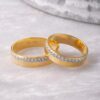 A wedding ring in single-row of round cut diamonds resting in 14K Italian yellow gold by Diagold Jewelry.