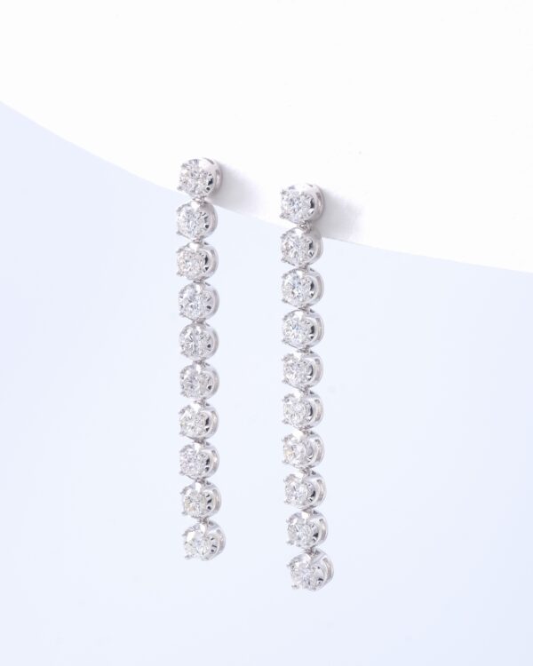 A pair of stunning diamond dangle earrings in round cut diamonds with VS-SI clarity and G-H color resting on 18K white gold by Diagold Jewelry.