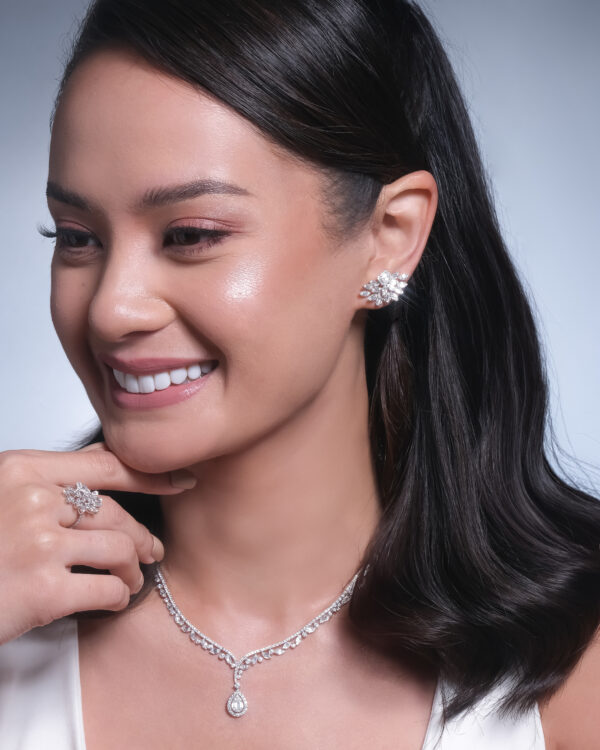 A stylish ring in round and tapered cut diamonds boasts a G-H color and VS-SI clarity, resting on 18K white gold by Diagold Jewelry.