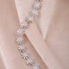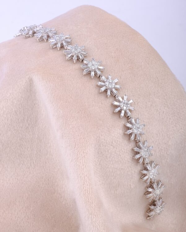 A flower bracelet in round and tapered cut diamonds boasts a G-H color and VS-SI clarity, resting on 18K white gold by Diagold Jewelry.
