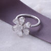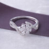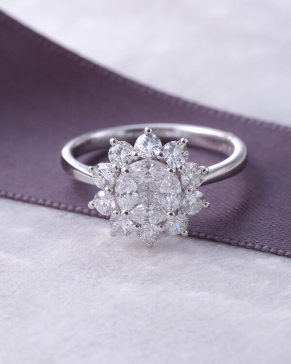 A flower ring in marquise, princess, and round cut diamonds boasts a G-H color and VS-SI clarity, resting on 18K Italian white gold by Diagold Jewelry.